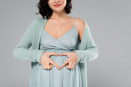 Cropped view of smiling pregnant woman showing heart sign near belly isolated on gray
