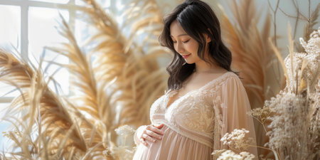 A serene pregnant woman in a flowing pastel dress stands amongst soft pampas grass, embodying grace and the natural glow of expectant motherhood.
