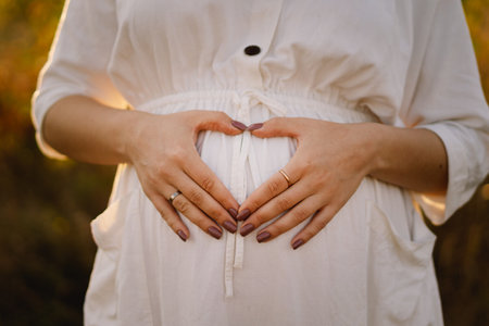 Close up picture of pregnant belly bump in third trimester outdoor in the park at fall