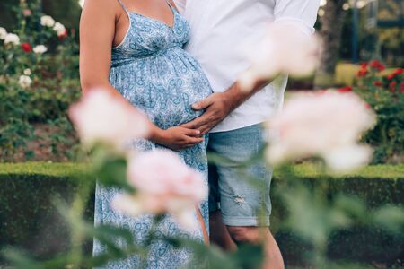 Pregnant woman with a man in a rose garden. Cropped close up portrait of a big belly with baby in it.