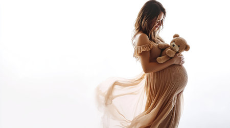 Pregnant woman in a flowing dress, standing with a teddy bear cradled in her arms, looking down lovingly, isolated on a white background