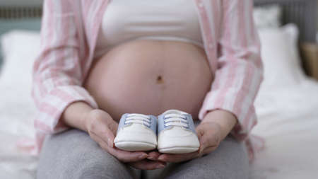 Closeup pregnant female holding cute childish booties on huge tummy relaxing at home awaiting baby
