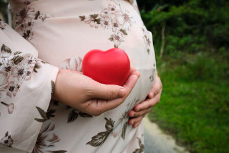 Selective focus of pregnant woman holding love symbol toy on the stomach