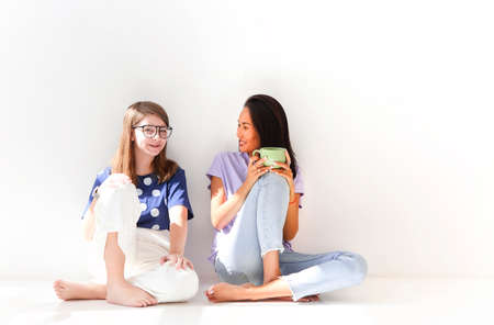 Two happy casual women relaxing with hot drink in new home. Young girls chatting talking about funny things gossip laughing in light apartment. Female roommates together.