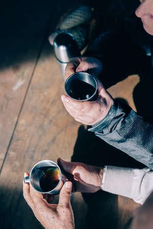 Top view of senior couple hands holding metal cups and drinking coffee over a wooden table