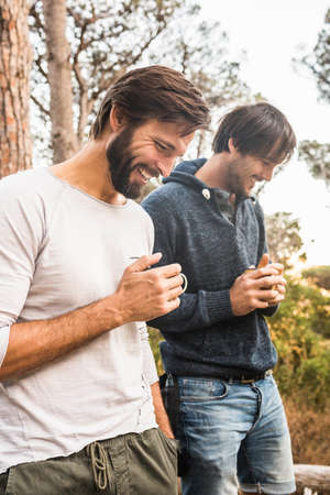 Two men drinking coffee in forest, Deer Park, Cape Town, South Africa