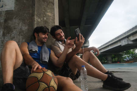 Diverse friends filled with joy assemble on sports ground to capture cheerful selfie. Group of multiracial male friends radiating with happiness meets on sports ground to snap delightful selfie