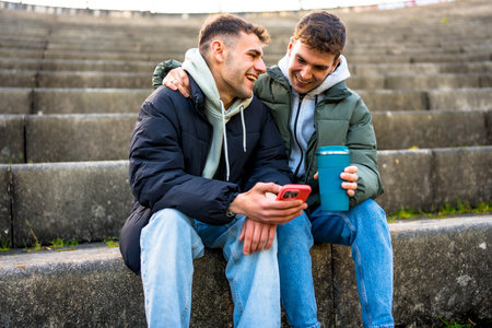 Two men are sitting on steps, enjoying a reusable coffee cup and sharing a laugh as they look at a smartphone together