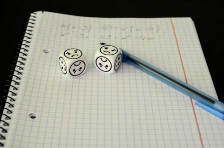 Four brightly colored dice featuring mathematical symbols are arranged diagonally on a sheet filled with mathematical formulas and diagrams.