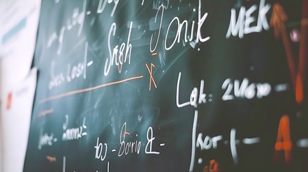 Intensely inscribed blackboard displaying numerous intricate mathematical formulas and calculations, A chalkboard with mathematical equations and formulas written on it