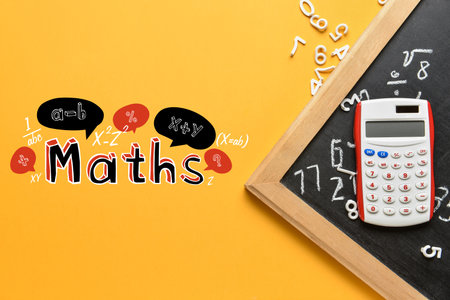 Toys word with the word MATHS with symbol of maths on yellow background. Education concept.
