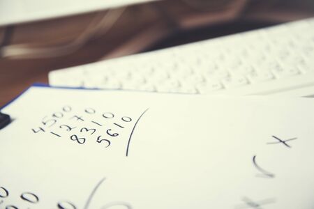 Mathematics book written by hand with arithmetic problems and pencil case, to do list, marble table
