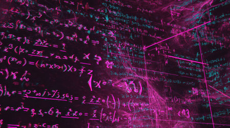 Vivid mathematical equations and symbols glow in pink tones against a dark backdrop, showcasing a blend of science and art through creativity.