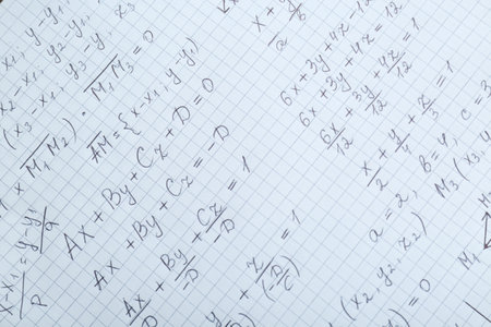 Sheet of paper with different mathematical formulas, top view