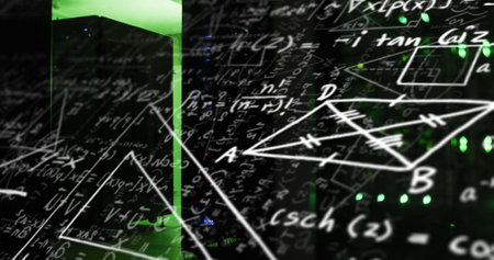 Image of mathematical equation and diagrams against illuminated server rack in server room. Digital composite, multiple exposure, solutions, education, networking, technology and network server.