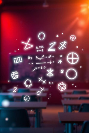 A chalkboard shows bright equations and imaginative drawings, creating an engaging learning space.