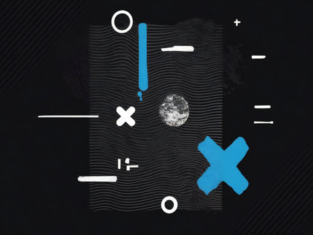 Displaying math graphic showing formulas and circles on teal grid, overlaying polygons with nodes. Technology, innovation, data visualization, digital art, geometric design, network analysis, abstract composition