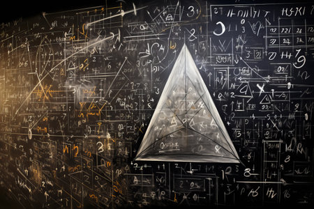 An abstract background featuring a chalkboard with complex mathematical equations written in chalk