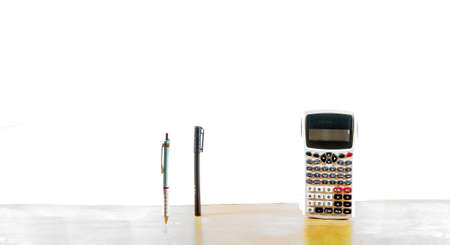 School supplies on wooden background with copy space. Calculator, pencils and pens. advertising back to school