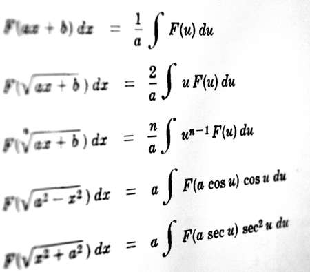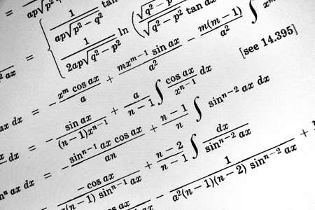 Close up of an old textbook with algebra formulas. Background of numbers and letters.
