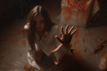 Girl zombie in blood. Asian Woman ghost with blood. Horror scary fear in dark house creepy crawling move slowly creeping out. Hair covering face her eye looking to camera, Halloween festival concept