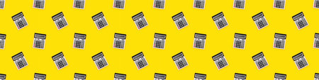 Seamless pattern with a large silver calculators on yellow background. Financial banner. Mockup design texture. Business card. Copy space. Concept of accounting, profit, loss, tax. Digital stationery