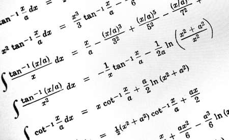 Close up of an old textbook with algebra formulas. Background of numbers and letters.