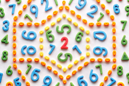 Multicolored small bright children's numbers for development from zero to nine lie randomly on a white background and the number two stands