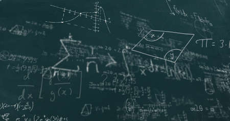 Image of mathematical equations moving on green background. education, knowledge and school concept digitally generated image.