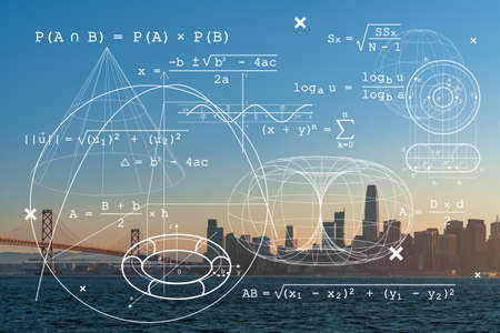 City view, Bay Bridge and San Francisco Skyline Panorama from Treasure Island, sunset, California, United States. Technologies, education concept. Academic research, top ranking university, hologram