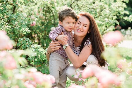 Mother and little son portrait in park. Summer lifestyle portrait, sun on background.