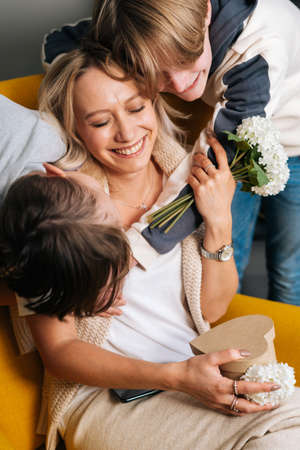 Two small sons gives beloved mother beautiful bouquet of flowers and box gift with present congratulating with holiday. Cheerful woman receives gift from child. Concept of family holidays celebration.