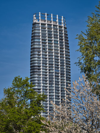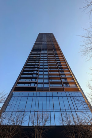 A striking modern high-rise building under a bright blue sky, showcasing contemporary architecture and urban living elements. Ideal for design and real estate projects.