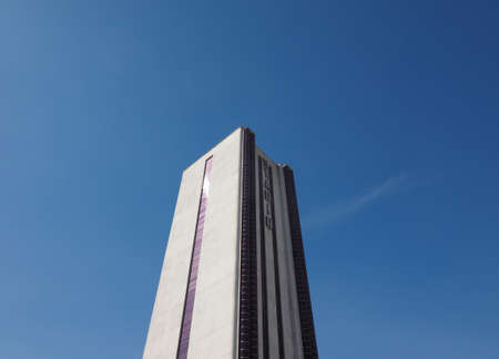 The modern architectural building or skyscraper with bright blue sky. Low angle view of tower central or office or work place. Abstract picture of city lifestyle or urban lifestyle concept. AIG42.