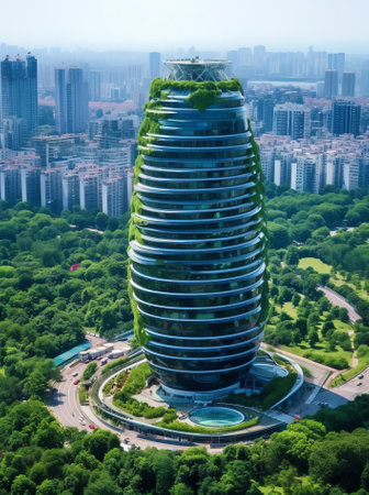 Symmetrical glass-adorned tall building stands proudly in city skyline with numerous windows