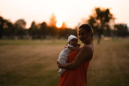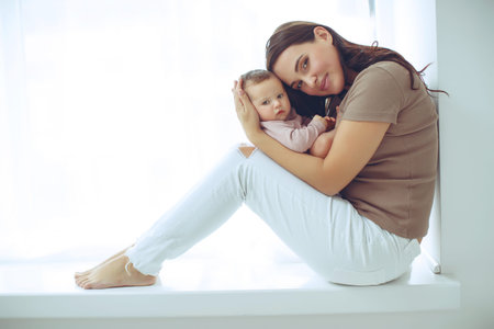 A mother lovingly gazes at her infant baby, holding the child close in her arms. Cute infant child is calm. Love of mother and child. Happy childhood. Family relationships, motherhood and fertility