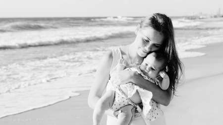A beautiful young woman, a brunette with long straight hair, a sweet smile, plays with her young son outdoors in the summer on a wooden dais near the sea, holds the boy in his arms