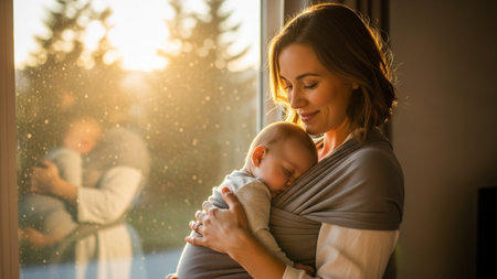A mother lovingly holds her sleeping baby in a sling, bathed in the warm glow of the setting sun by a window.