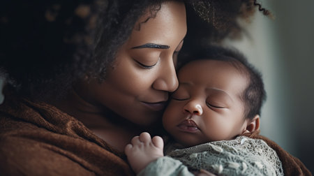 Close up of a loving mother holding her newborn baby, heads touching in a tender embrace. depicts maternal bond, care, and family love.