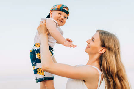 Happy young family have fun on the beach, mother with son play on the beach in summer
