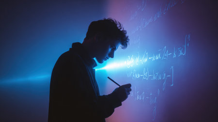 A young student focuses on solving math equations on an illuminated wall, surrounded by a serene atmosphere in a study environment at night.