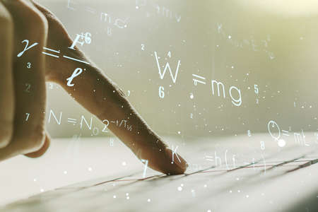 Physics and math theme hologram with formula drawings over computer on the desktop background. Top view. Multi exposure. Concept of education.