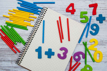 Multi-colored numbers and signs on a white background. Mathematical example. Maths learning concept.