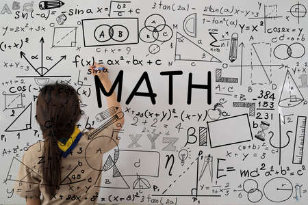 thoughtful child or adolescent with formulas, learn