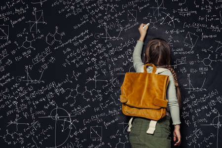 Child girl against big blackboard with formulas, back view