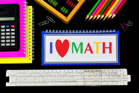 I love math-the text is written in colored letters in a student's notebook. Mathematical calculations, get knowledge at school in the classroom. Calculator and abacus for solving arithmetic problems.