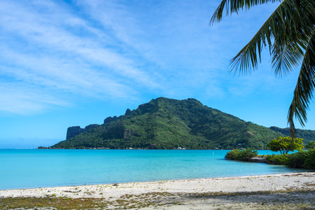 A stunning view of Maupiti Island from a pristine beach lined with palm trees, offering a glimpse of turquoise waters and lush greenery in French Polynesia