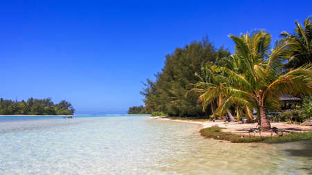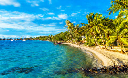 View of the sandy beach with palm trees, Bora Bora, French Polynesia