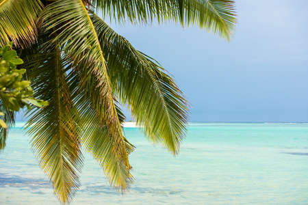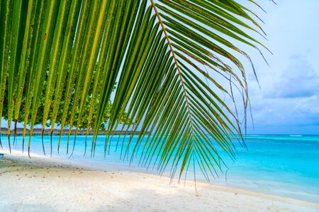 Green palm leaves on the background of azur water and white sand of Maldivian beach