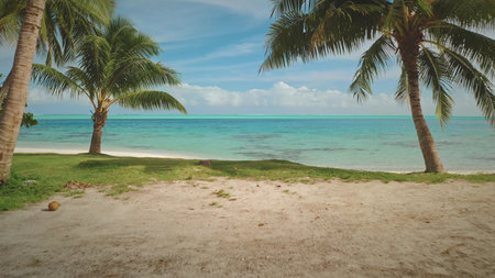 Lush coconut palm trees growing on a beautiful sandy beach with turquoise water coral reef lagoon and blue sky. Remote wild nature paradise, exotic summer luxury travel. Natural background. Drone shot